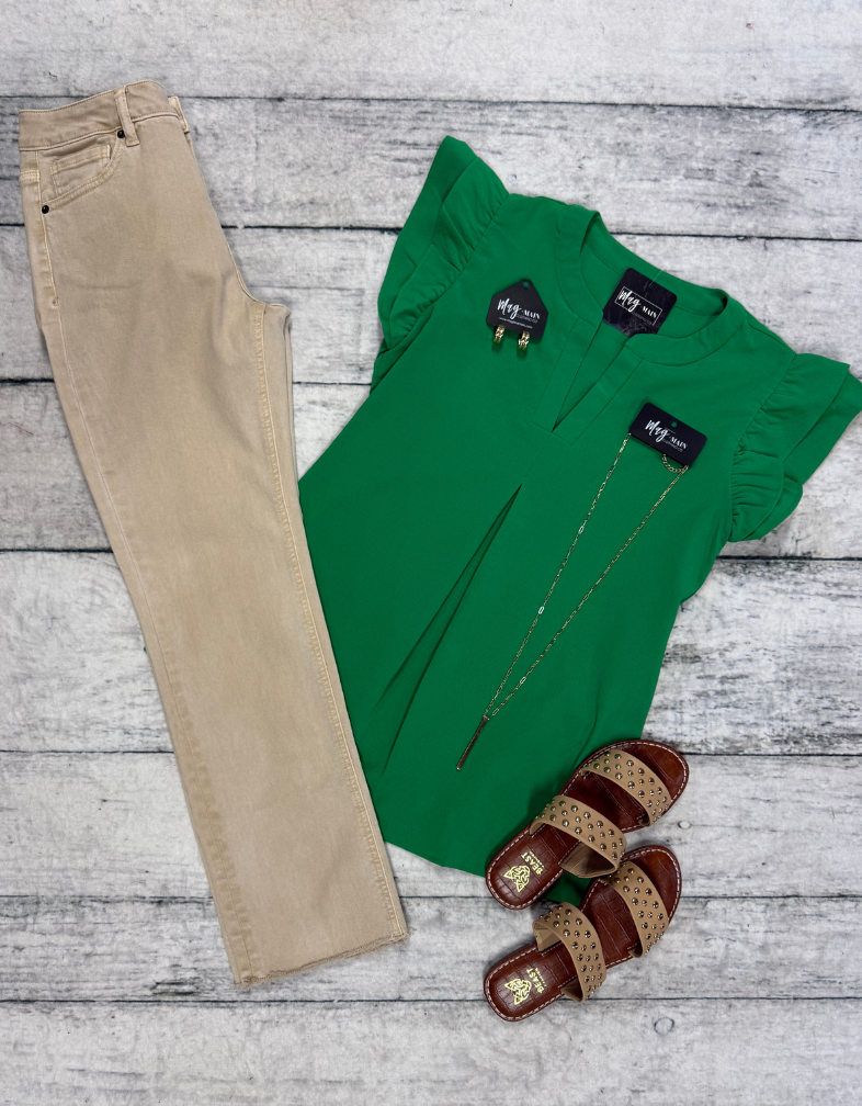 Loving the ruffles on the sleeves. The v-neck line makes this a little dressier. Pair this with tan, white, or black pants.